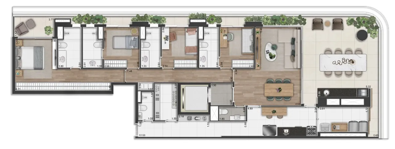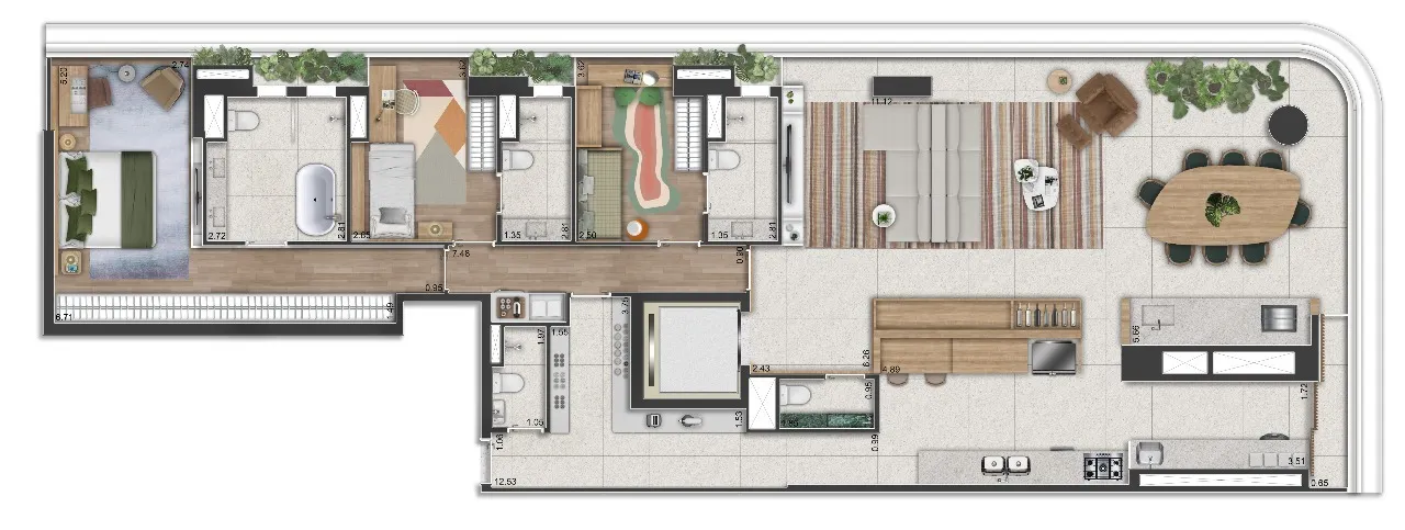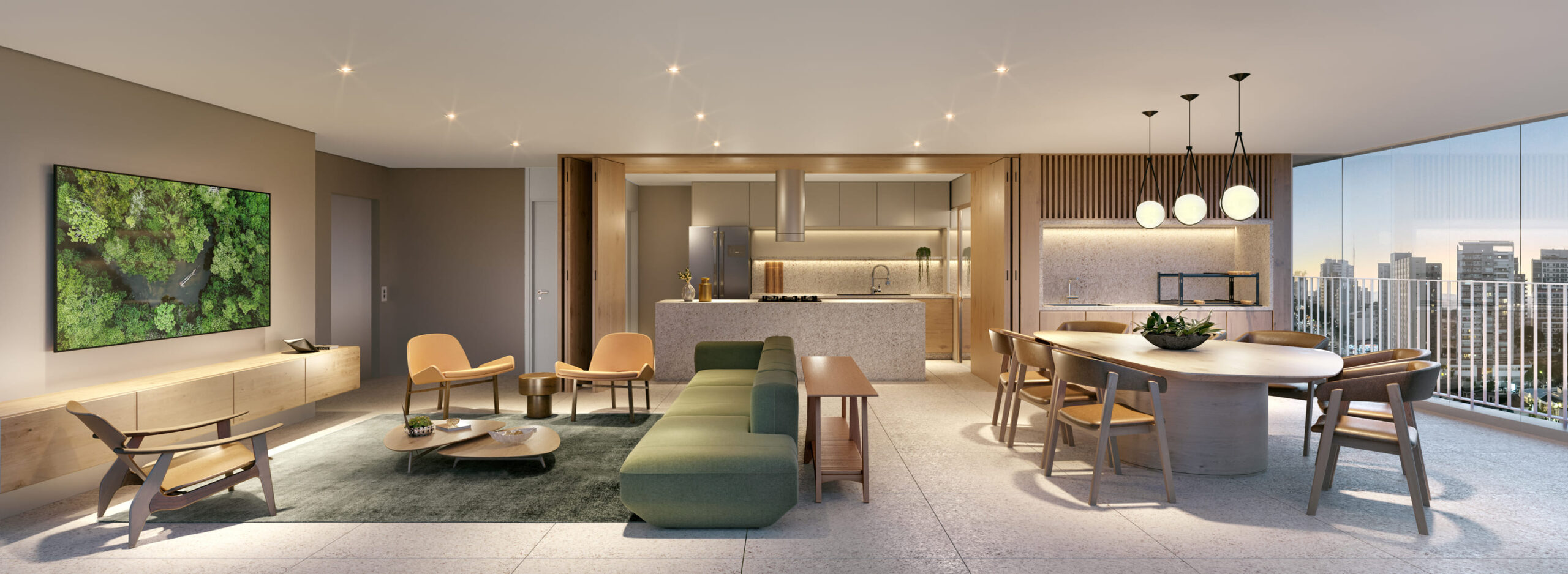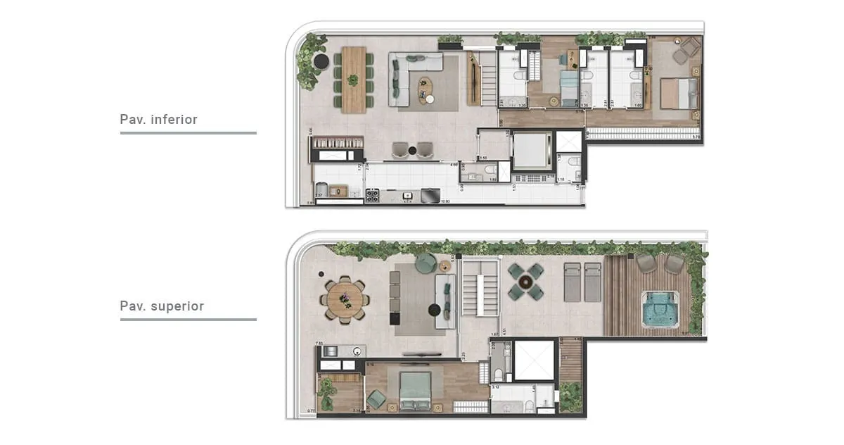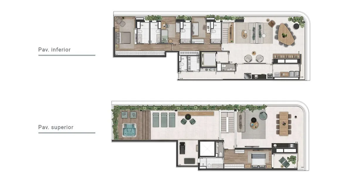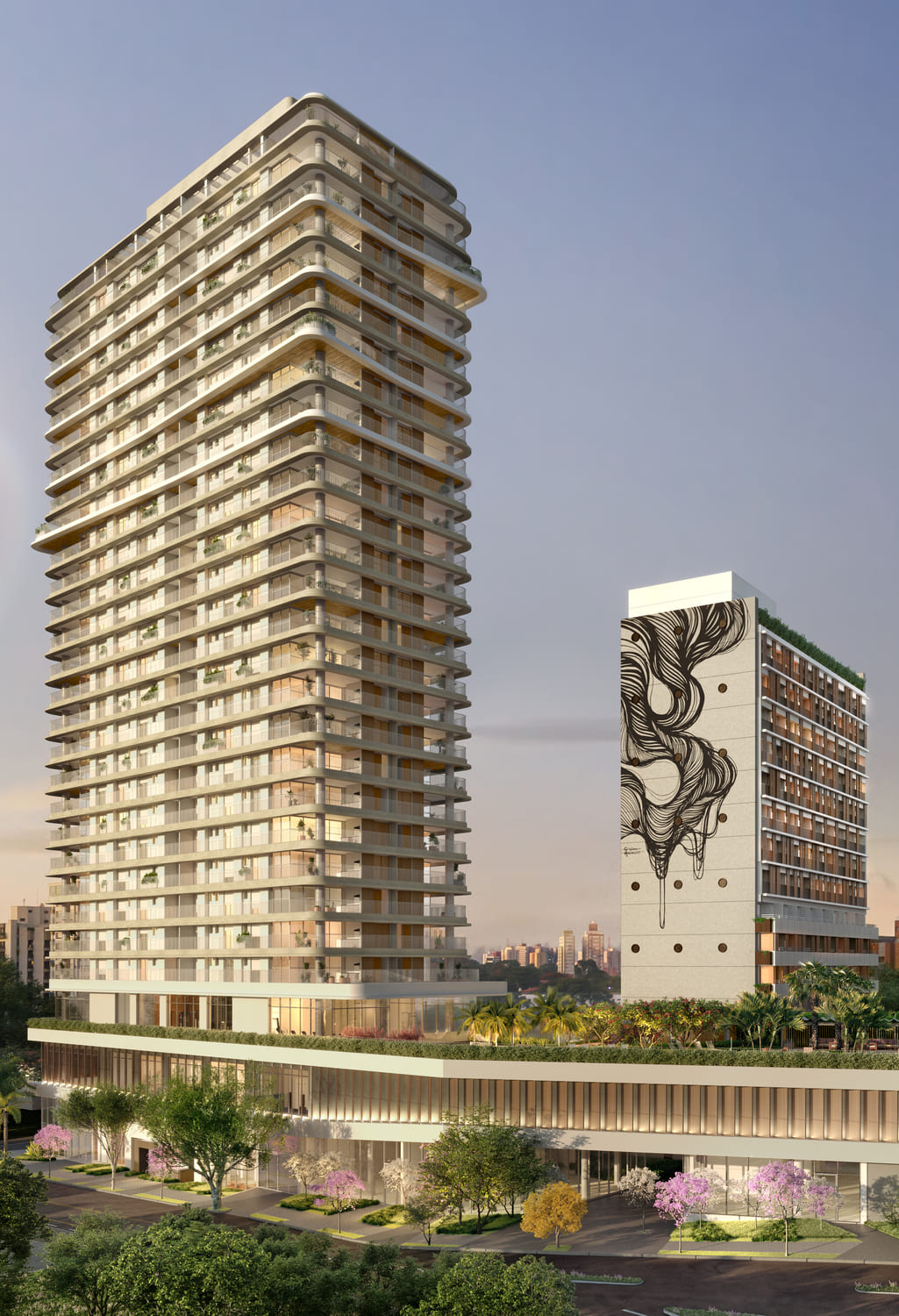 Seus amplos apartamentos foram pensados para trazer à rotina do morador muito conforto, com plantas de 154m² com 3 suítes, 193m² com 4 suítes, duplex de 374m² com 4 suítes e duplex de 300m² com 3 suítes.
